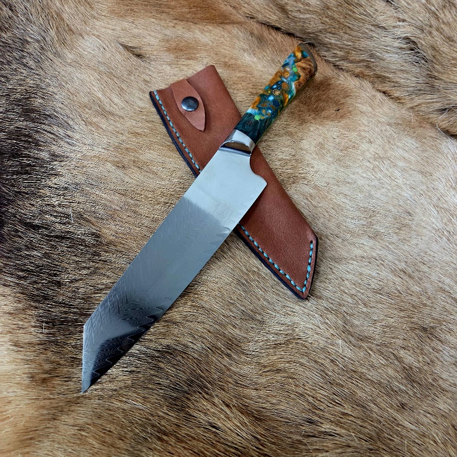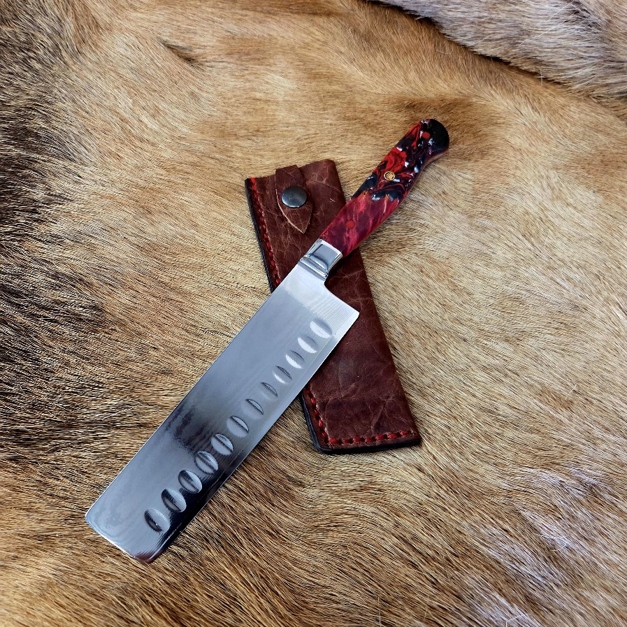 The beautiful Nikiri style knife is 11 1/2″ overall length with a 6 1/2″ blade. It has a VG-10 core and 66 layers of Damascus Steel. The handle is maple and Alumilite resin. Custom leather blade guard.