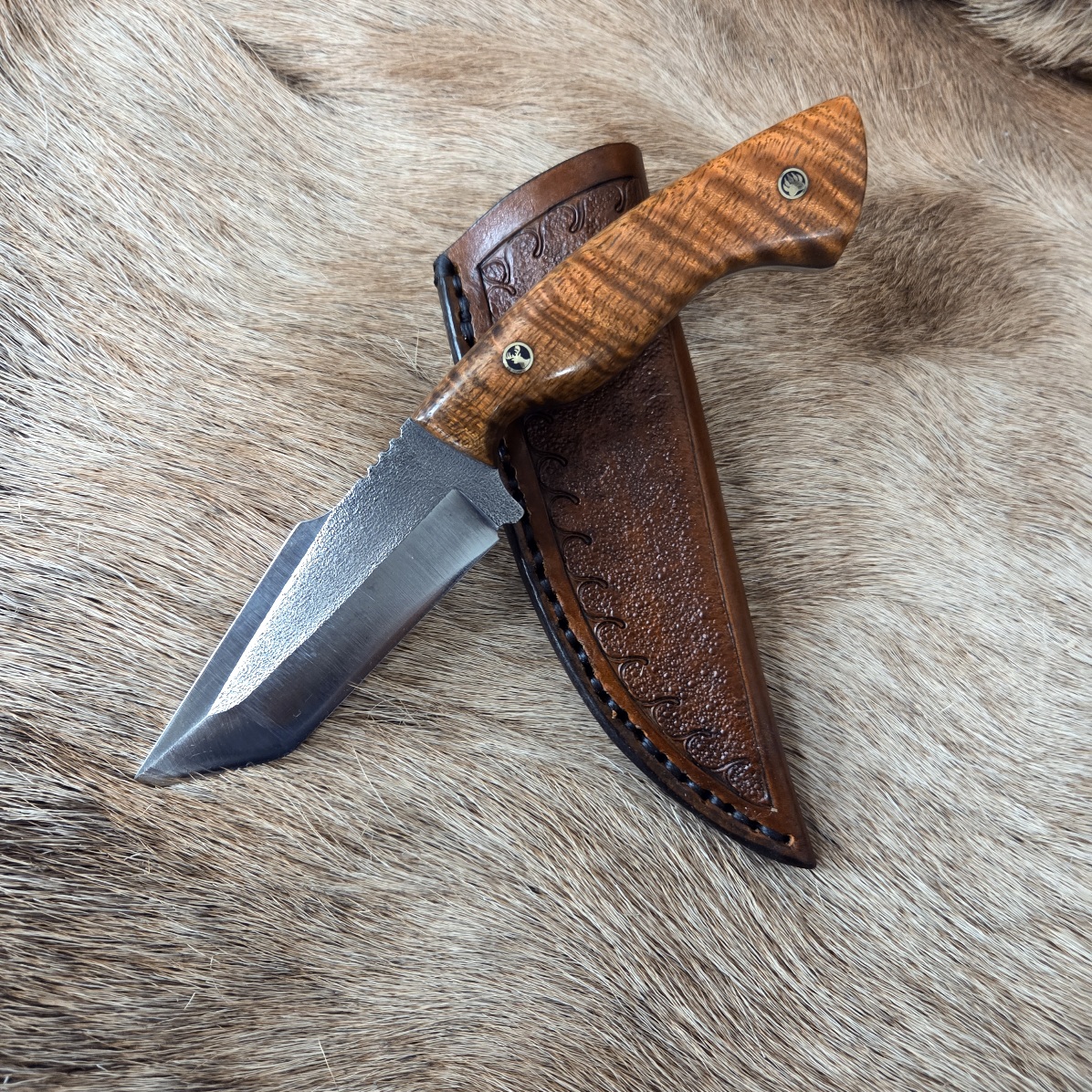Bushcraft Hunting Style Knife with Custom Leather Sheath. Strong D2 Steel and a Curly Mango handle with mosaic pins. Great knife for your side.