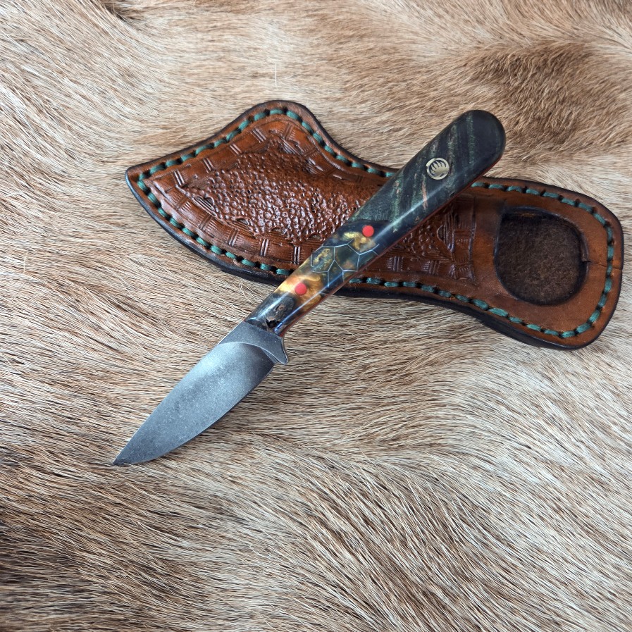 6″ Overall Length with a 2 1/2″ Blade. The Blade is made of 440c Stainless Steel with a Hammered Finish. The handle is a beautiful Dyed Maple Alumilite® Resin. Back Cross Draw Leather sheath.