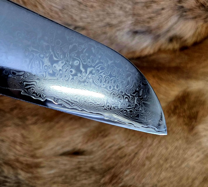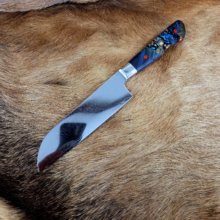 12 1/4″ Overall Length.  7″ Cutting Edge. AUS-10 Core with 66 Layers of Damascus Steel. Maple/Resin Gold Flake Handle With Mosaic Pin. Custom Leather Blade Cover.