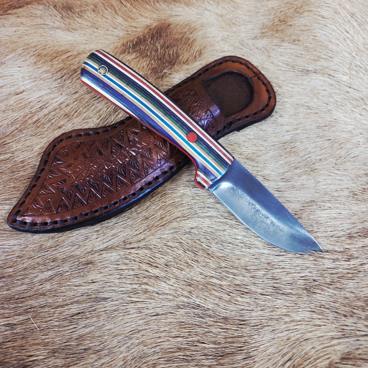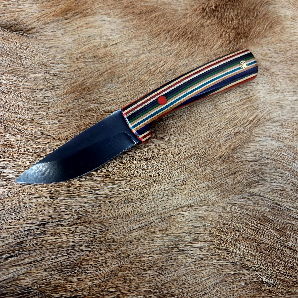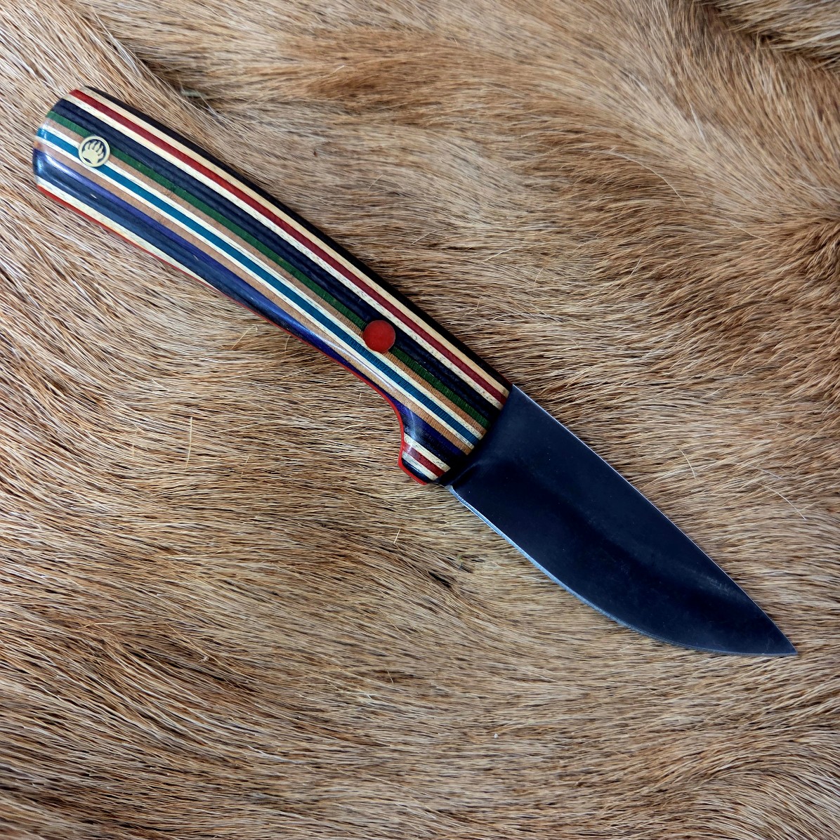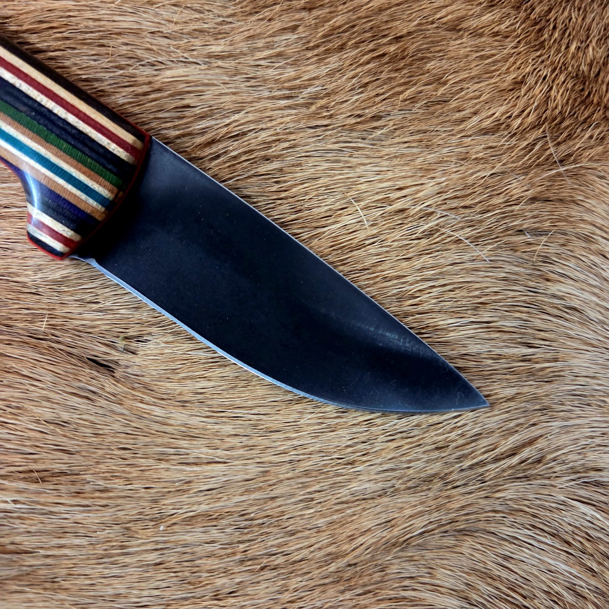Check out this re-purposed skateboard deck handle! If you want a unique knife this is it. Great versatile, back draw custom sheath.