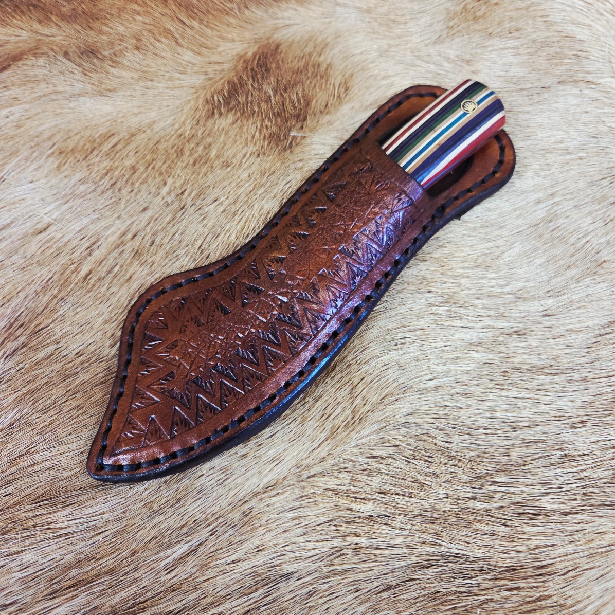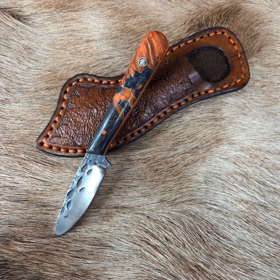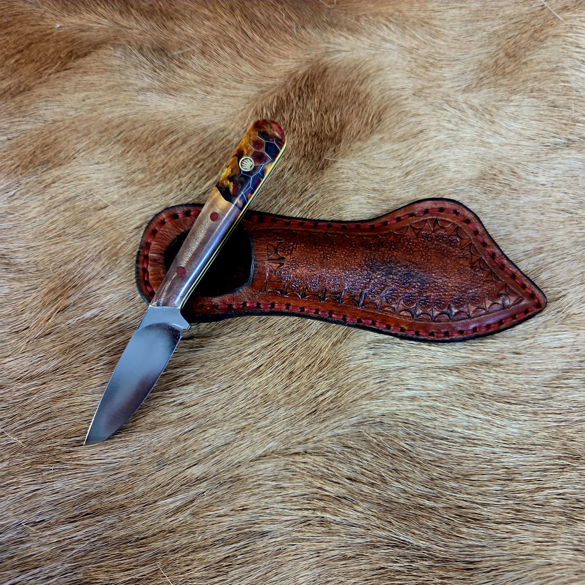 7 1/2″ Overall Length. 3 Cutting Edge. 440c Stone Washed Steel Blade. Original “repurposed” skateboard deck handle. Custom Back Draw Leather Sheath.