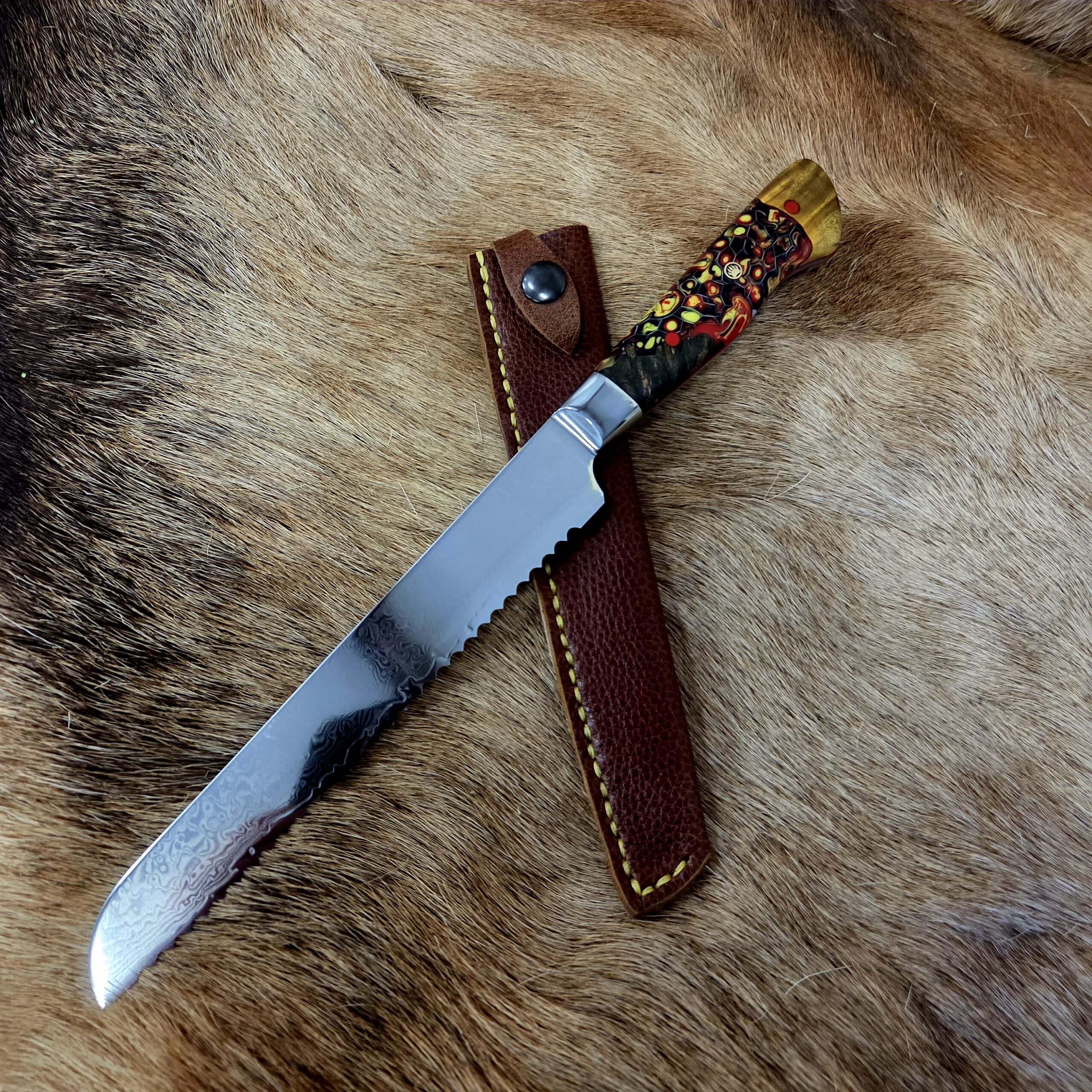 This is a custom 6 1/2″ Damascus “Ulu” with an Aus-10 Core and 66 Layers of Damascus Steel. It is finished with an Ash Burl Handle. Complete with a custom leather blade cover.