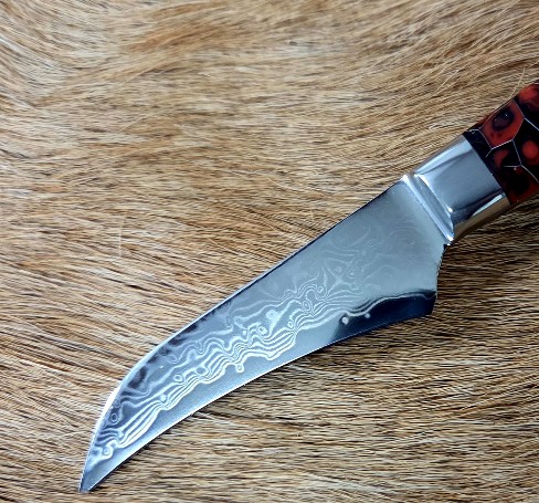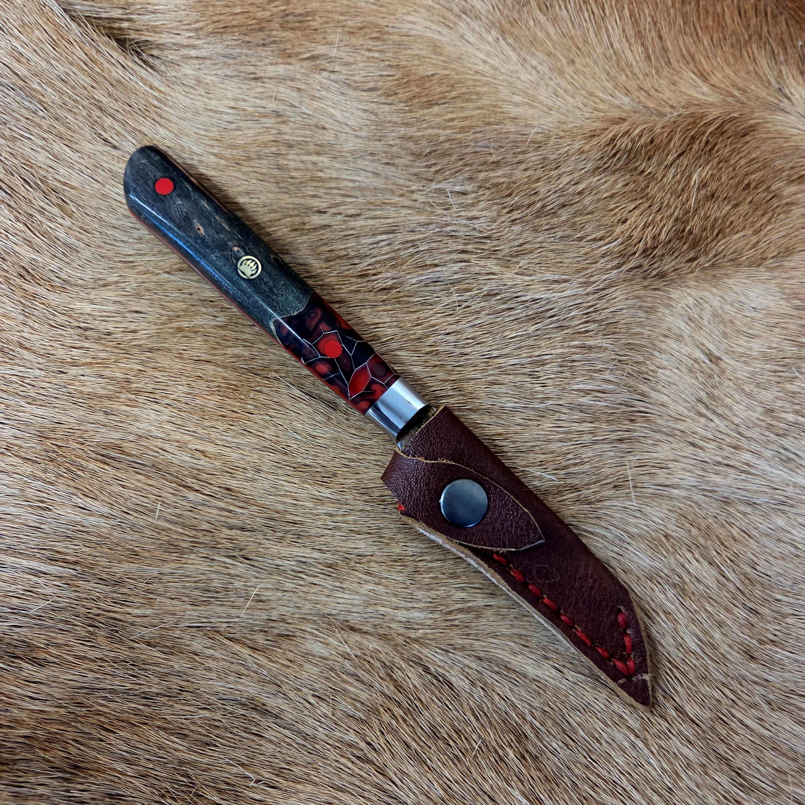 7 1/2″ Overall Length. 2 3/4 Cutting Edge. 66 Layers of Damascus Steel Blade. Beautiful Dyed Maple/Honeycomb Alumilite® Handle. Custom Leather Blade Guard.