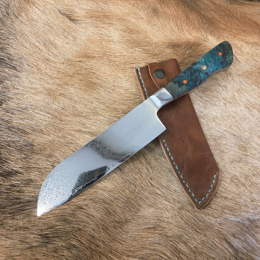 13 1/2″ Overall Length with an 8″ Cutting Edge. Aus-10 Core and 66 layers of Damascus steel. Dyed maple and Gold Flake Alumilite® resin handle. Leather blade guard.