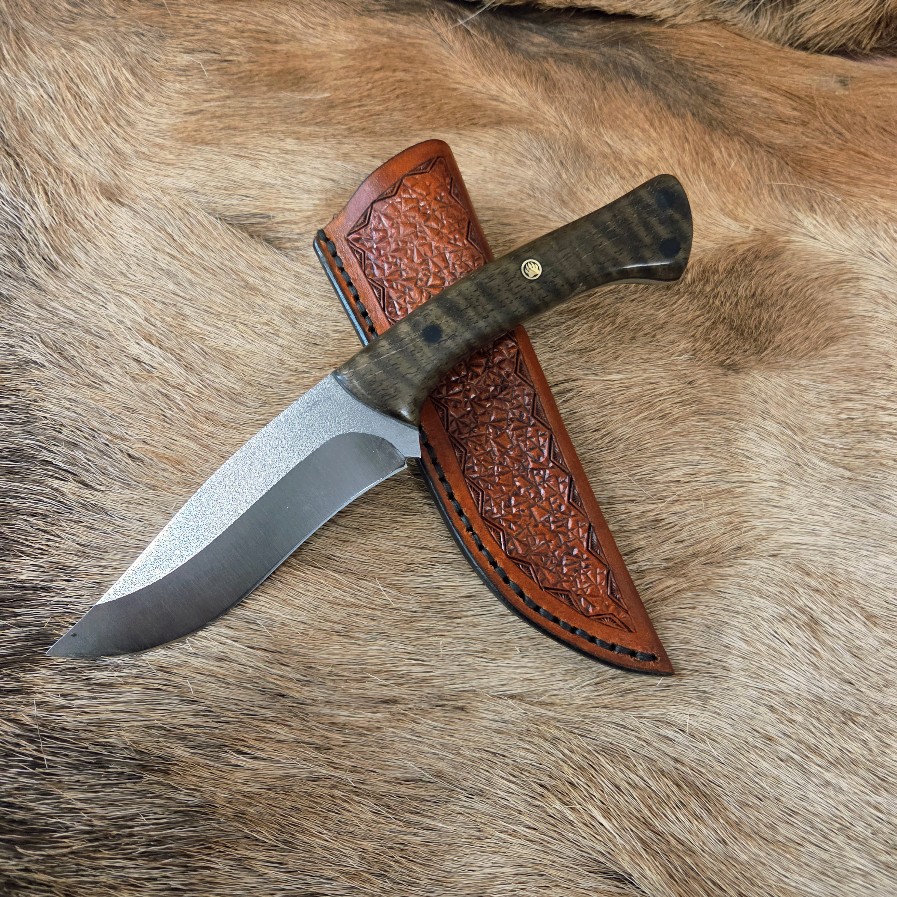beautiful dyed curly mango handle with mosaic pins. Custom hand stamped leather sheath.