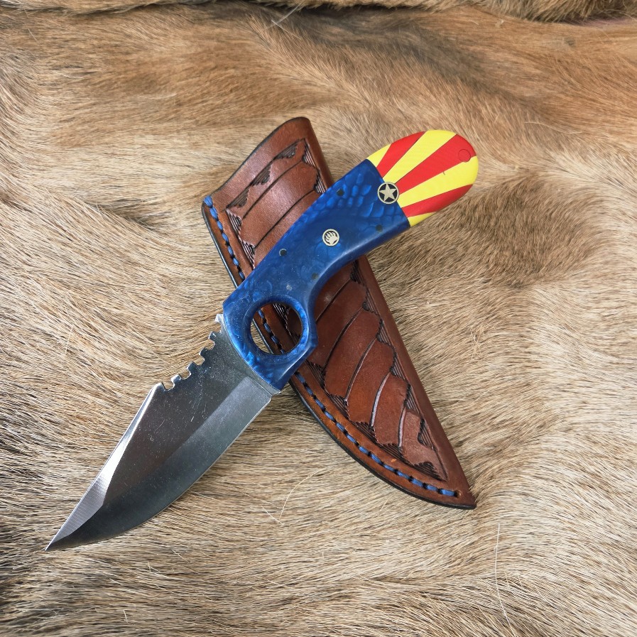 Bushcraft Hunting Style Knife with Custom Leather Sheath. Arizona Horseblanket design. Great gift or addition to your collection.