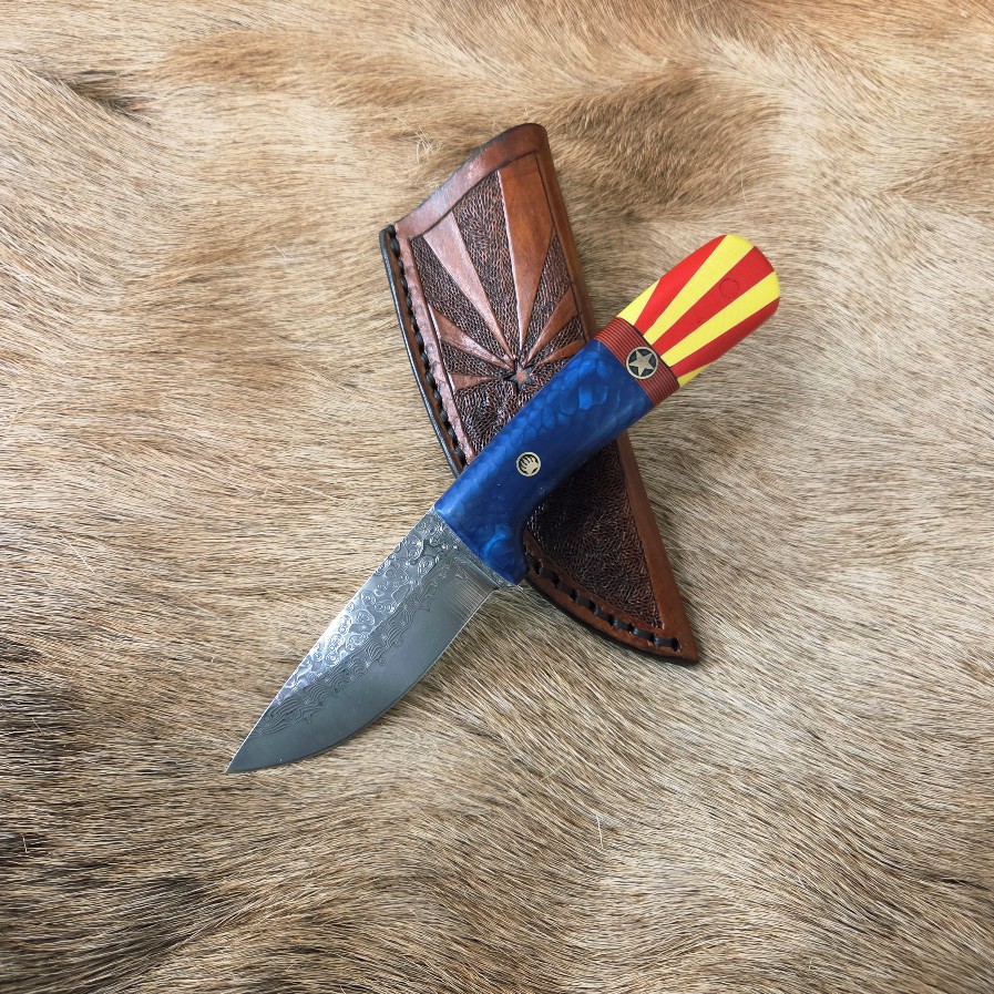 7 1/2″ Overall Length. 3 1/4 Cutting Edge. AUS-10core with 66 layers of Damascus Steel. Orange Juma®/G10 Resin handle. Custom