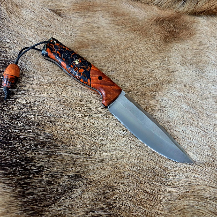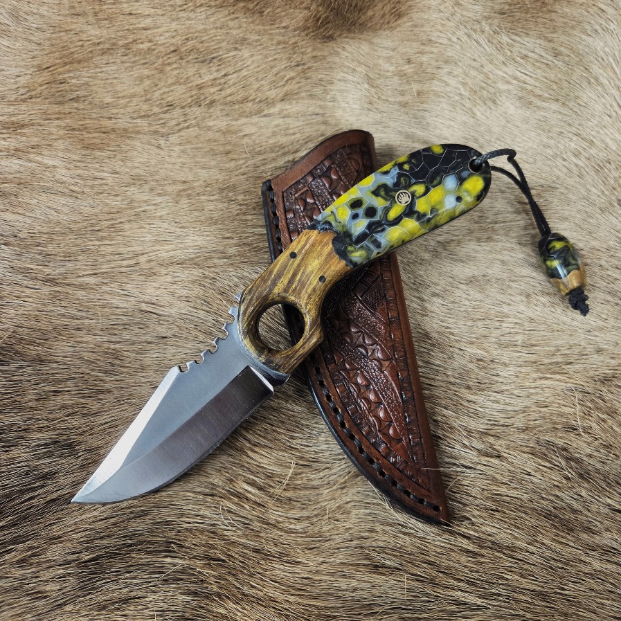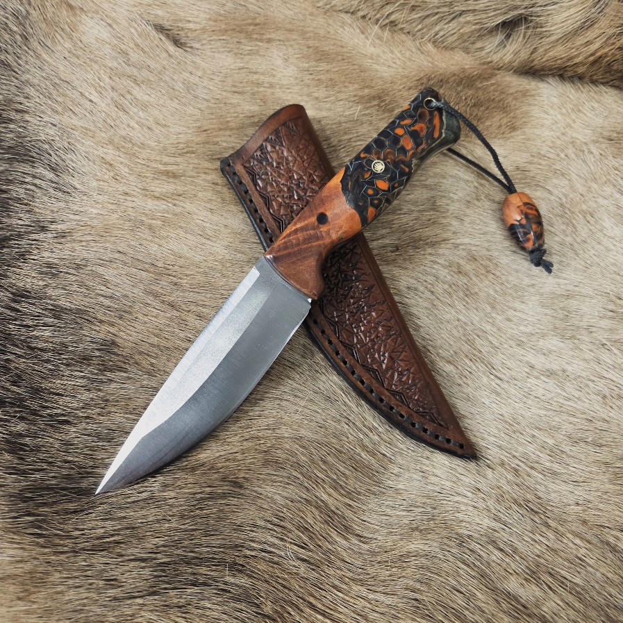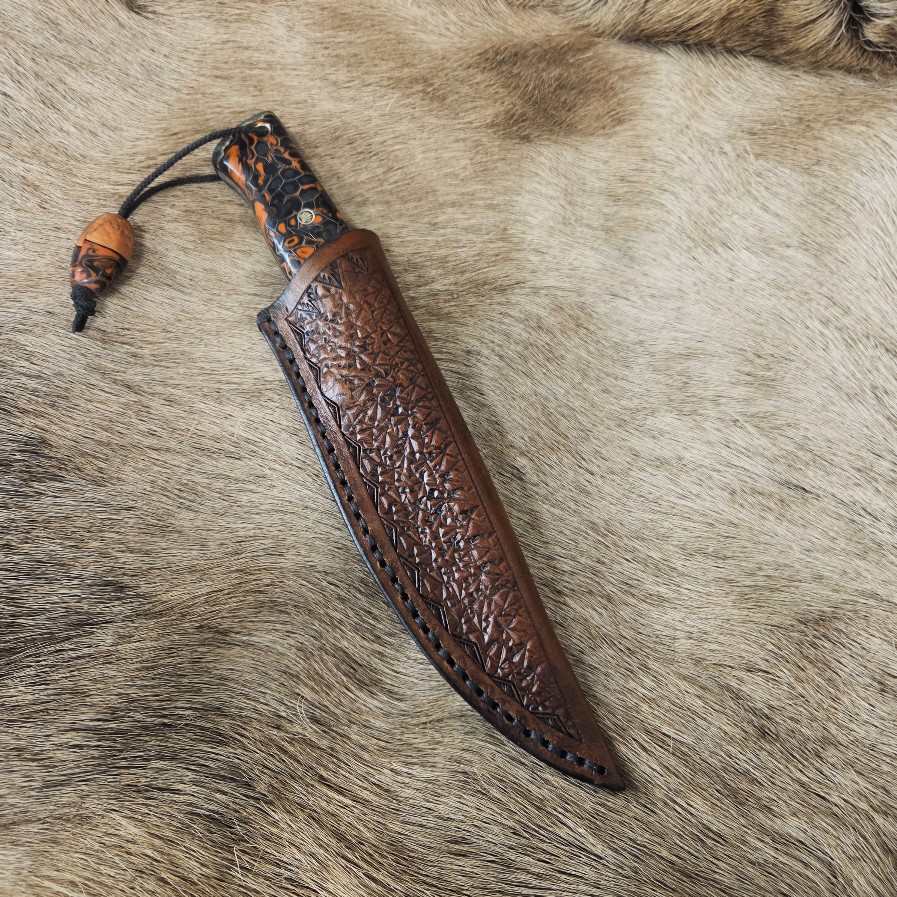 9 3/4″ Overall Length. 5″ Cutting Edge. 4116 Stainless Blade. Dyed Maple/Alumilite® Honeycomb Resin Handle. Custom Leather Side Sheath. Great Outdoor Knife.