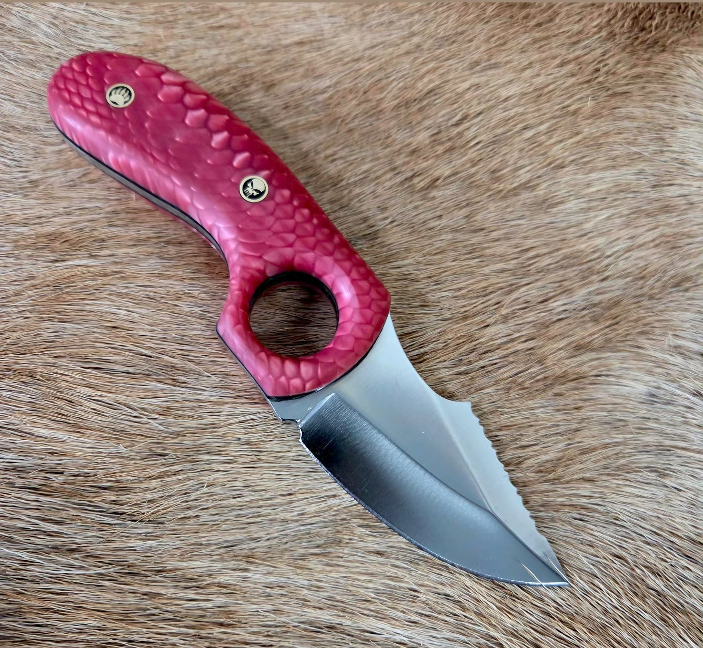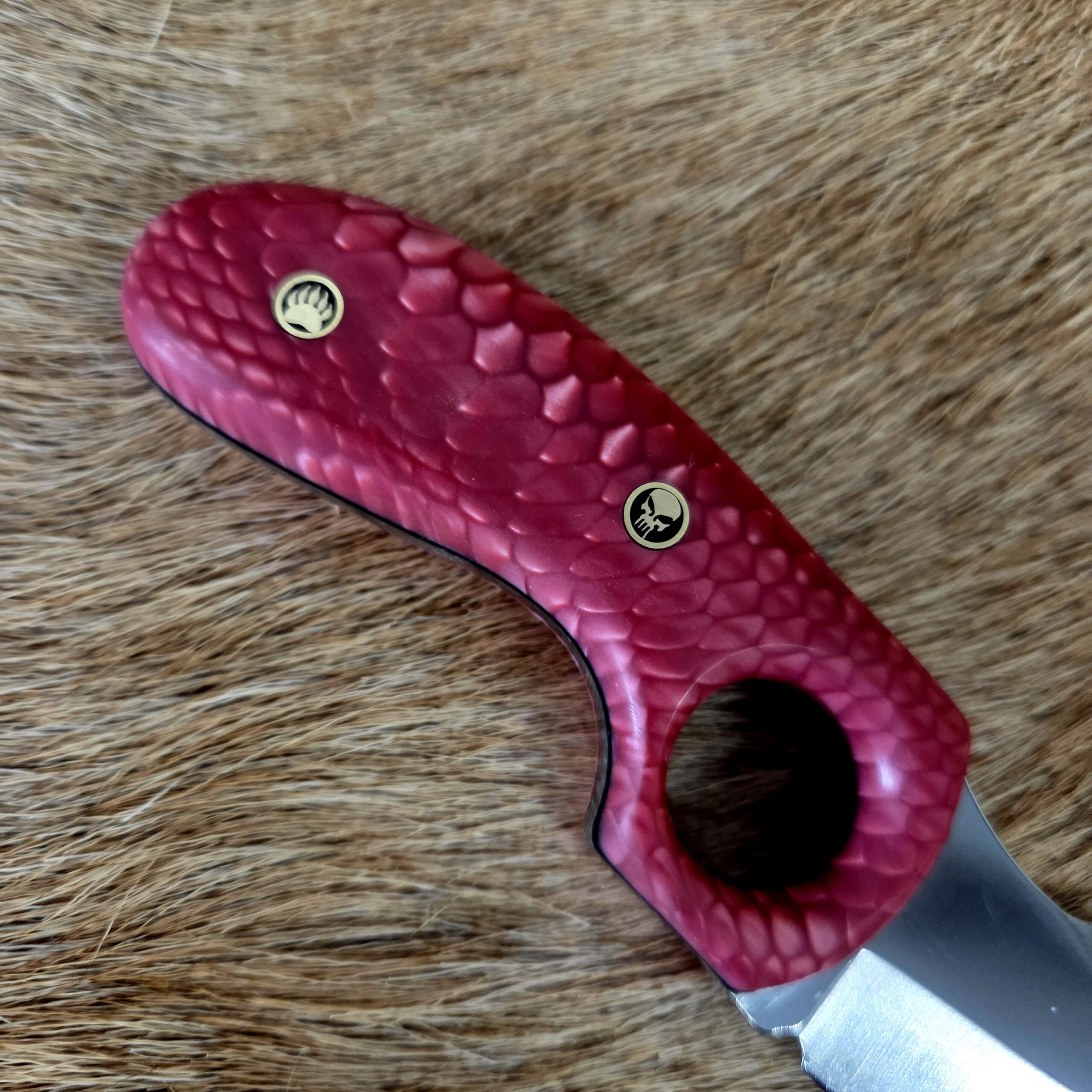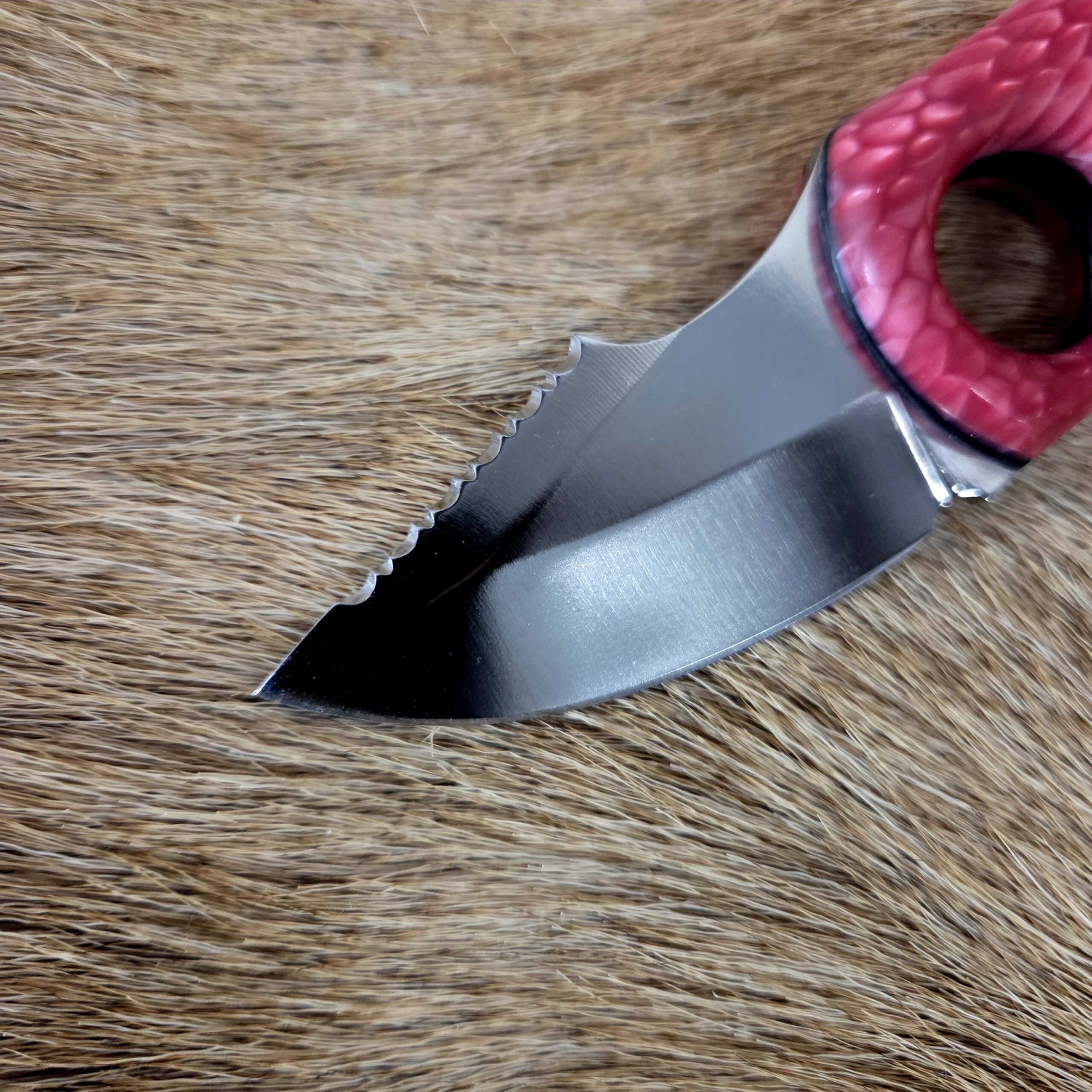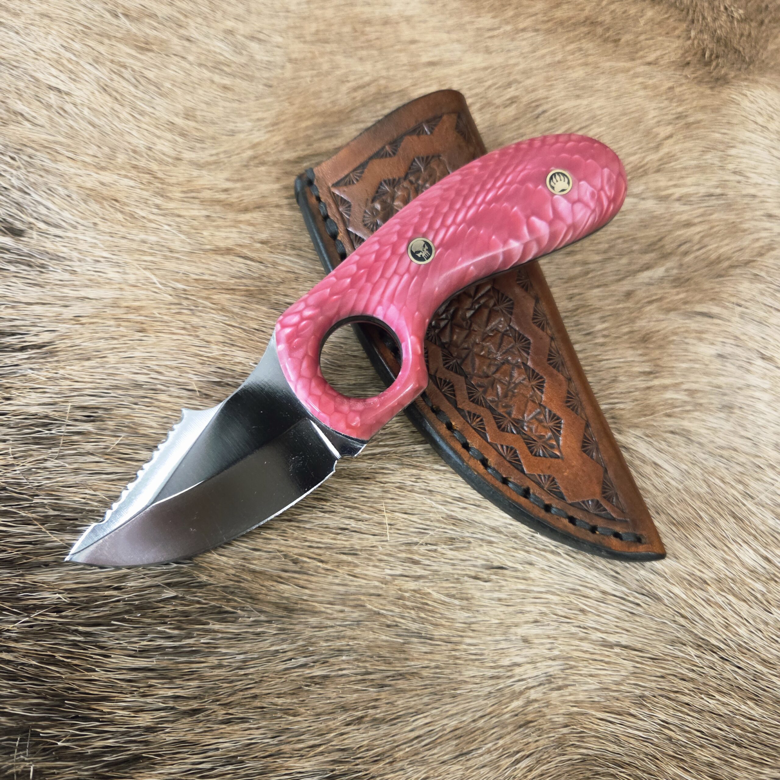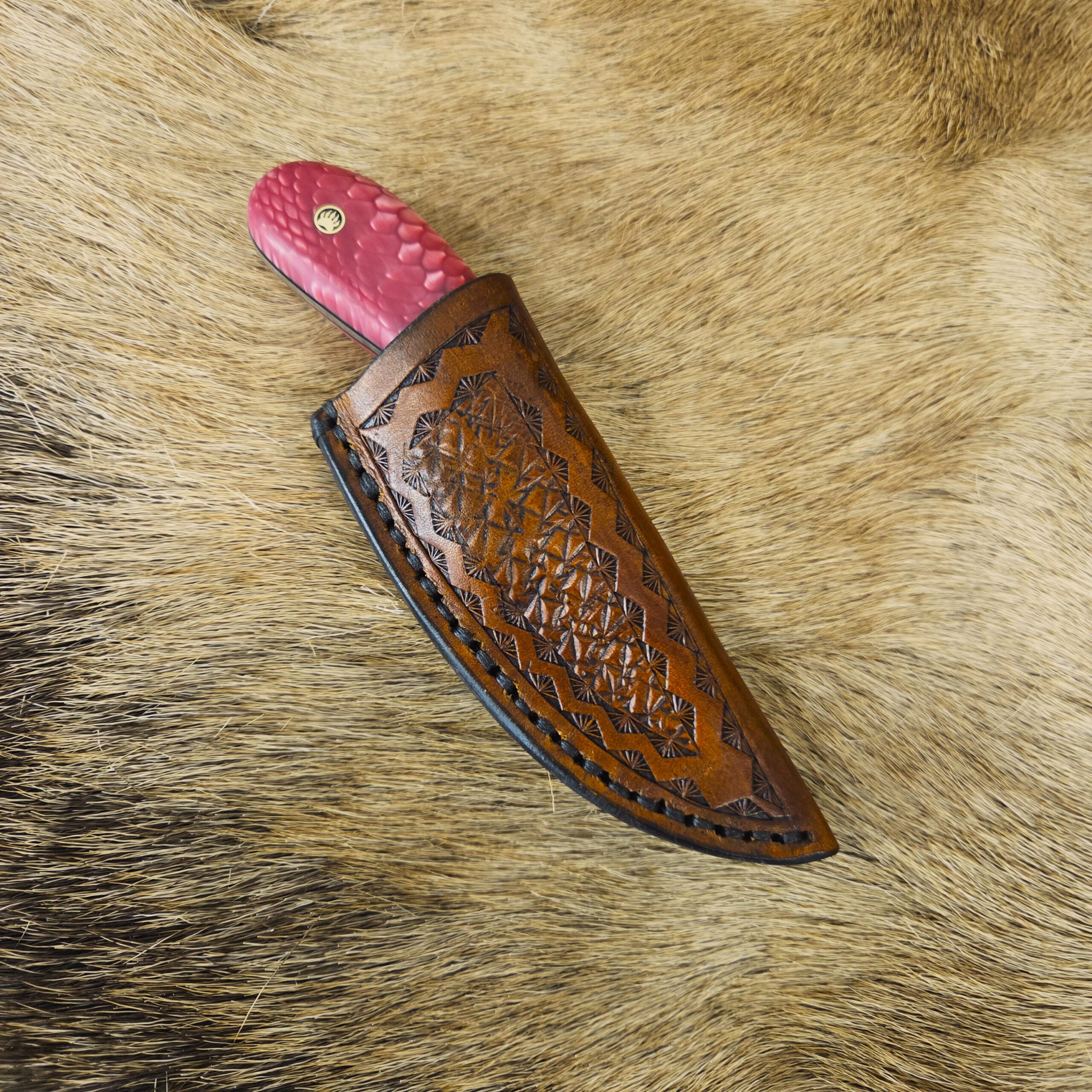 This knife is 6 1/4″ overall length with a 2 1/2″ cutting edge. The metal is 440C stainess steel. Pink Juma Snake Scale Handle. Great everyday carry, complete with a custom leather sheath.