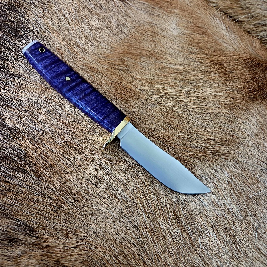 This knife is small but mighty. It offers a strong edge for retention and durability. Custom made leather sheath.