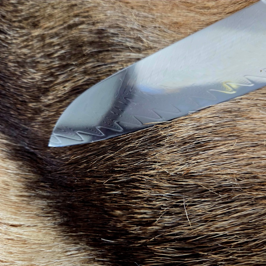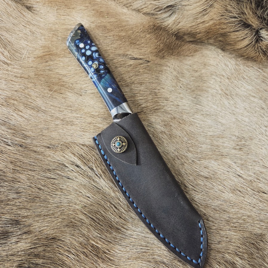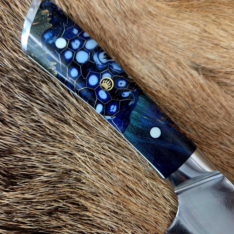 9 7/8″ Overall Length. 5″ Cutting Edge. AUS-10 Core with 66 Layers of Damascus Steel Feather Pattern.  Dyed Maple/Aluminum Honeycomb Resin Handle With Mosaic Pin. Custom Leather Blade Cover.
