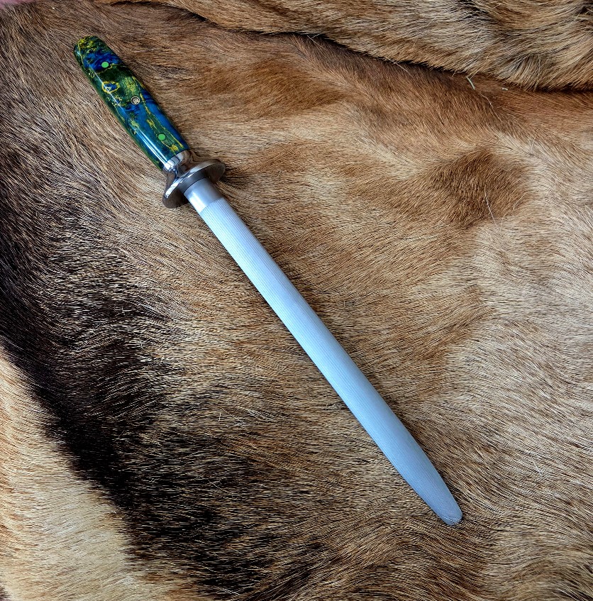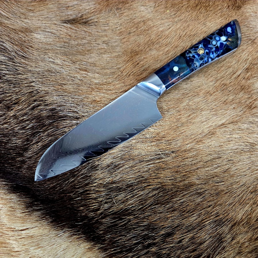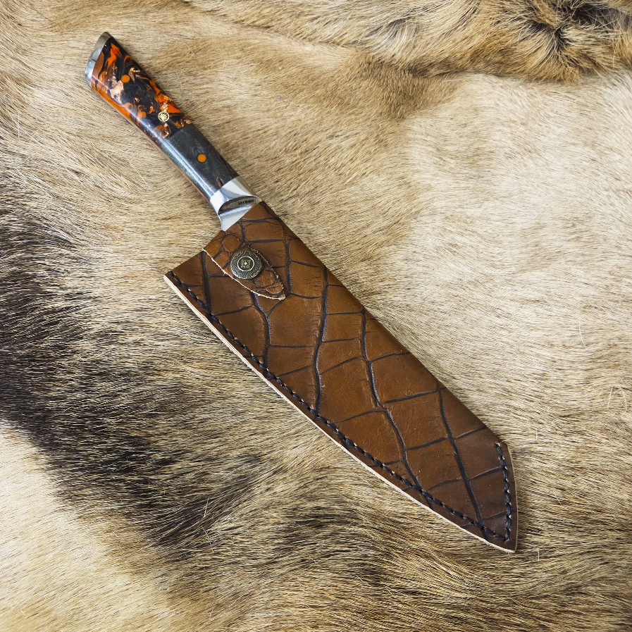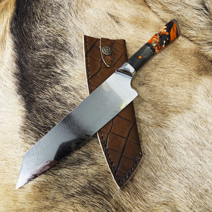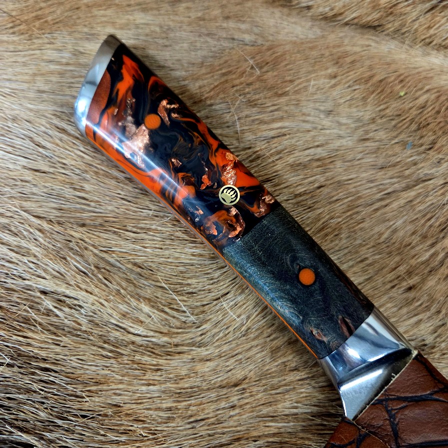 13 1/2″ Overall Length with an 8″ Cutting Edge. Aus-10 Core and 66 layers of  Feather Damascus steel. Dyed maple and Copper Flake Alumilite® resin handle. Leather blade guard.