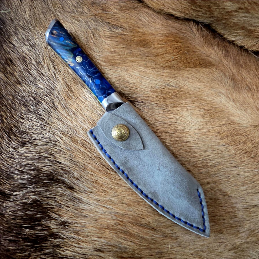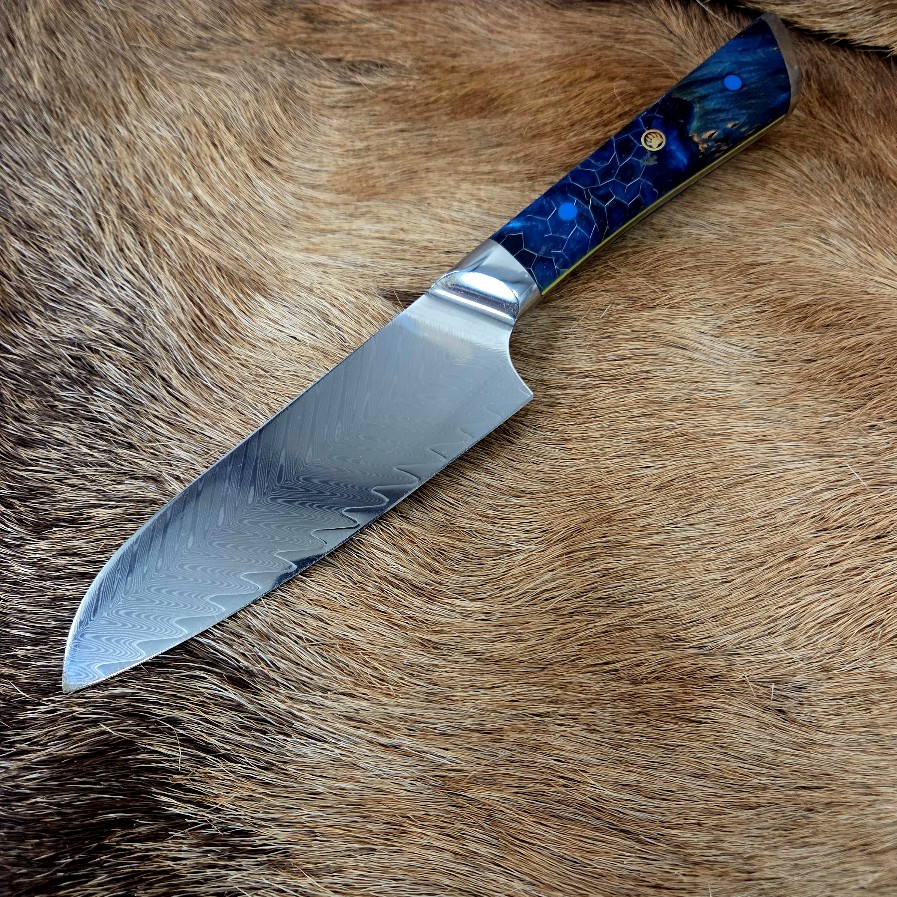 9 3/4″ Overall Length. 5″ Cutting Edge. AUS-10 Core with 66 Layers of Damascus Steel. Dyed Maple/Aluminum Honeycomb Resin Handle With Mosaic Pin. Custom Leather Blade Cover.