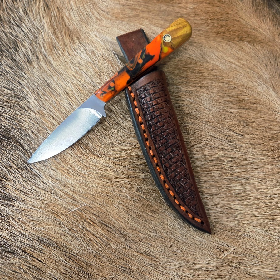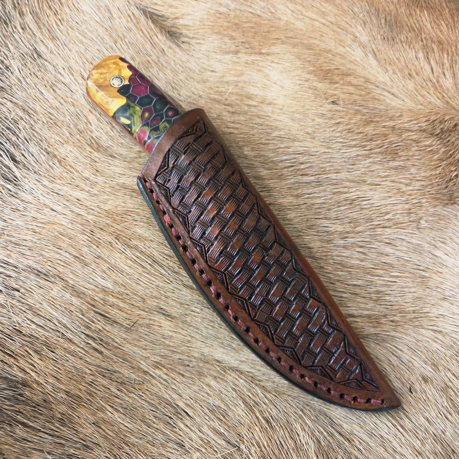 7 1/2″ Overall Length. 3 3/4 Cutting Edge. AUS-10 core with 66 layers of San Mai Forged Damascus Steel. Dyed Maple and Honeycomb Resin Handle. Custom Leather Sheath.