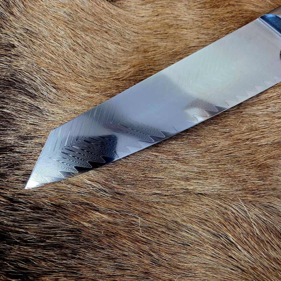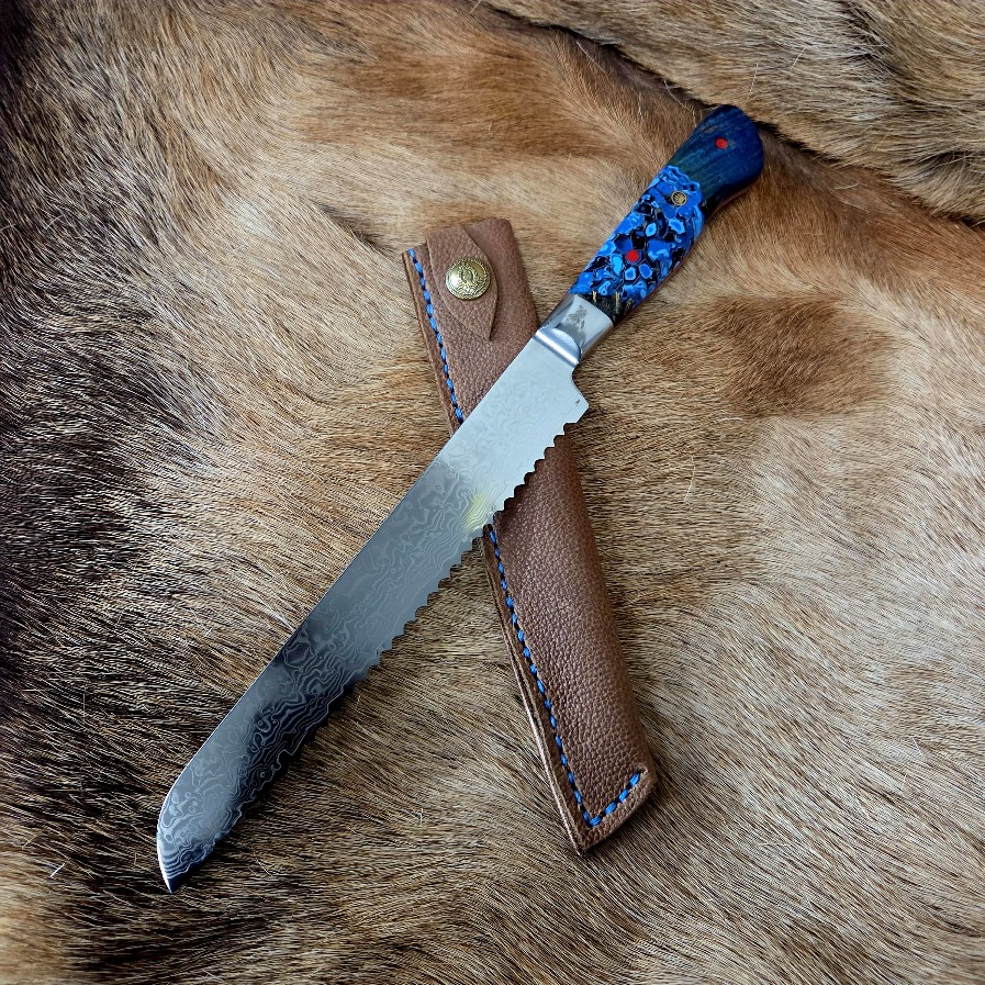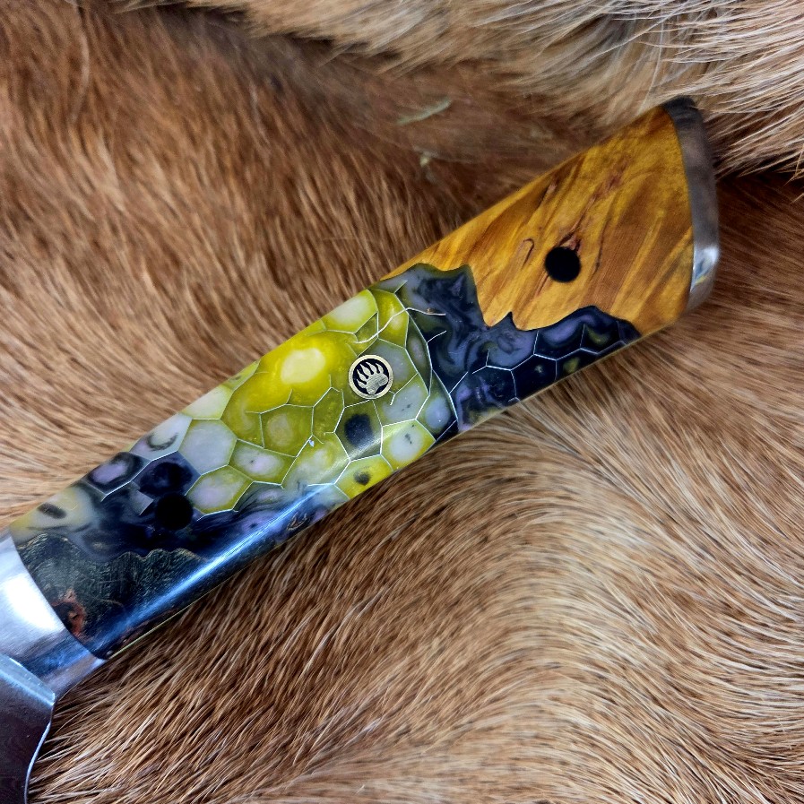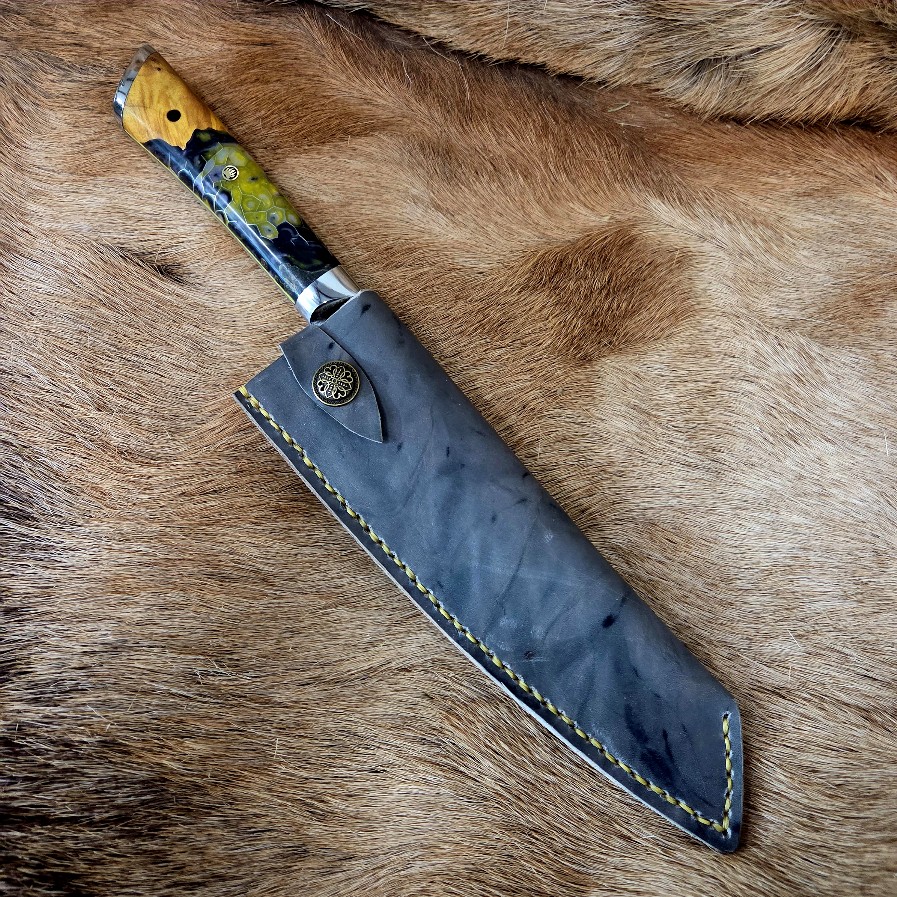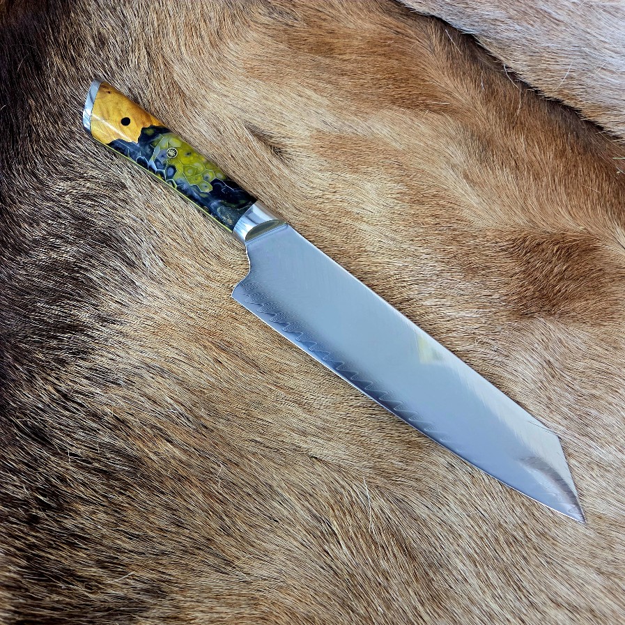 13 1/2″ Overall Length, 8″ Blade. Damascus Kiritsuke Chef’s Knife. Aus-10Core with 66 Layers of Damascus Steel. Dyed Maple and Alumilite® Honeycomb Resin Handle.