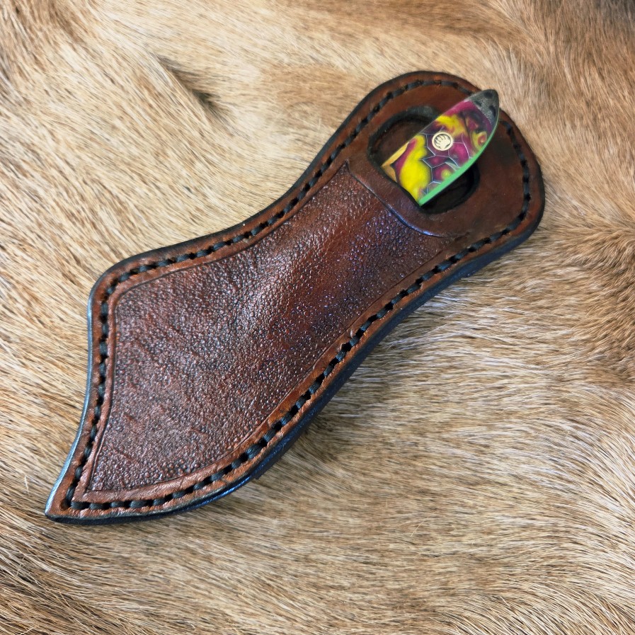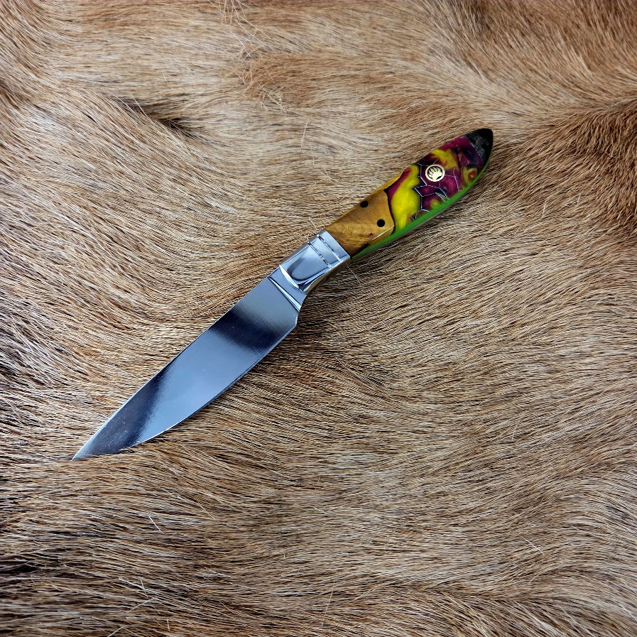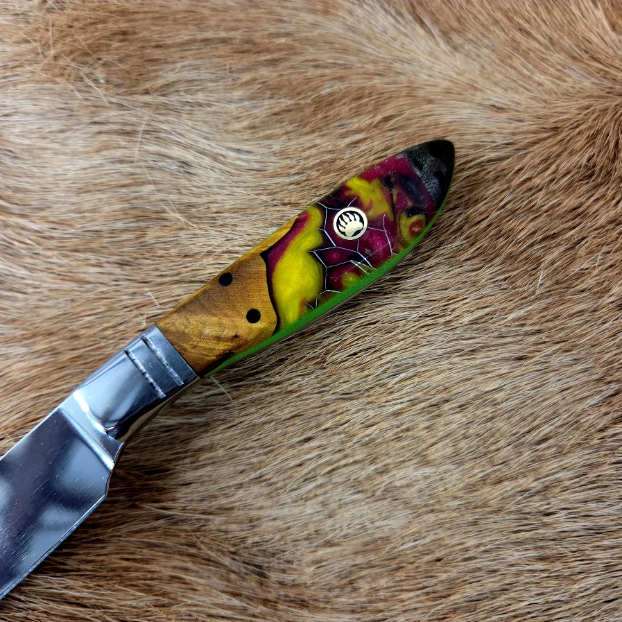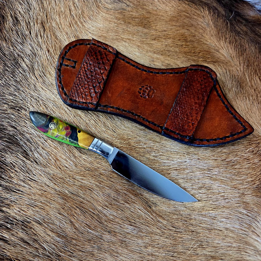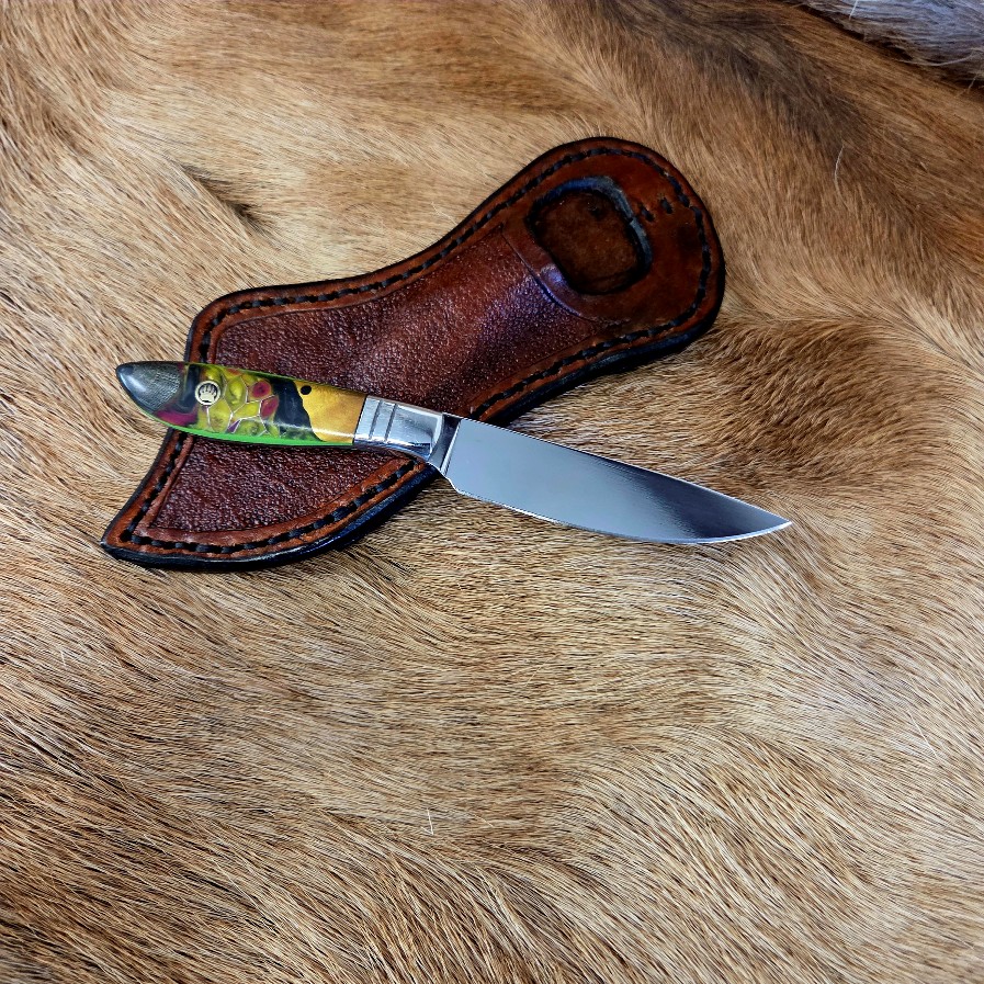 6 3/4″ Overall Length with a 3 1/4″ Blade. The blade is 440c Stainless Steel. The handle is dyed maple and Honeycomb Alumilite® resin. Custom leather back draw sheath. Great everyday carry (EDC) knife.