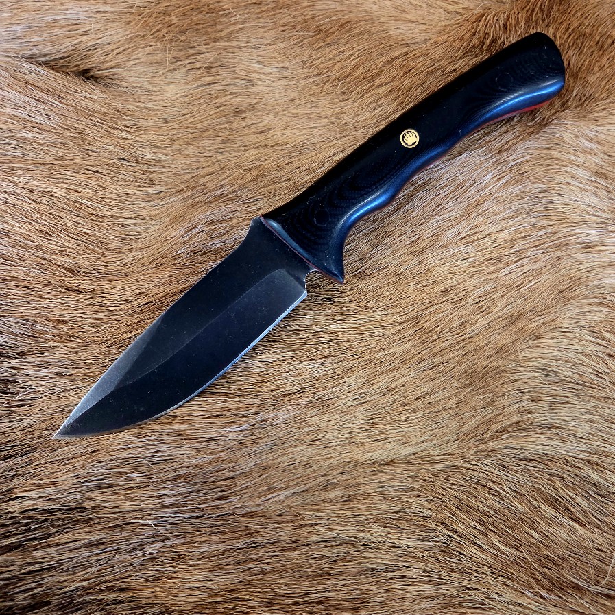 Great everyday carry knife to wear and is also well suited for field dressing. Custom made hand stamped back draw leather sheath.