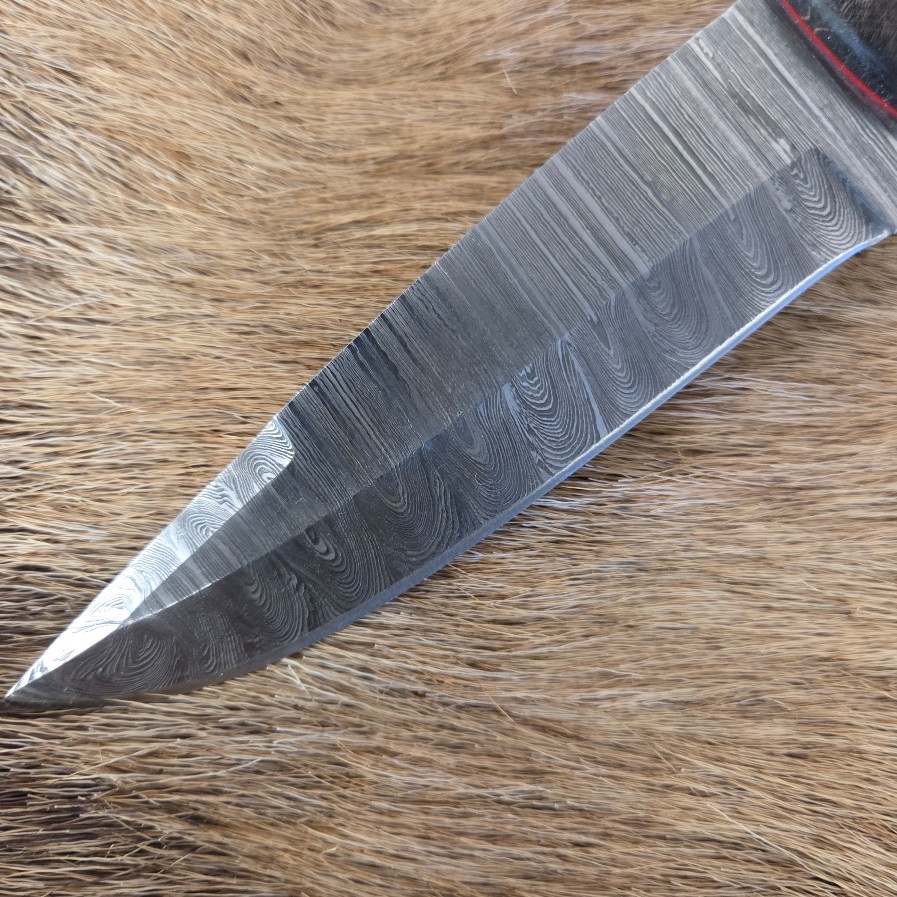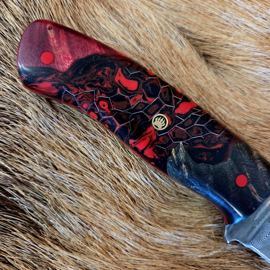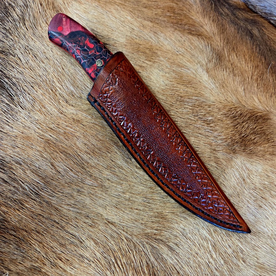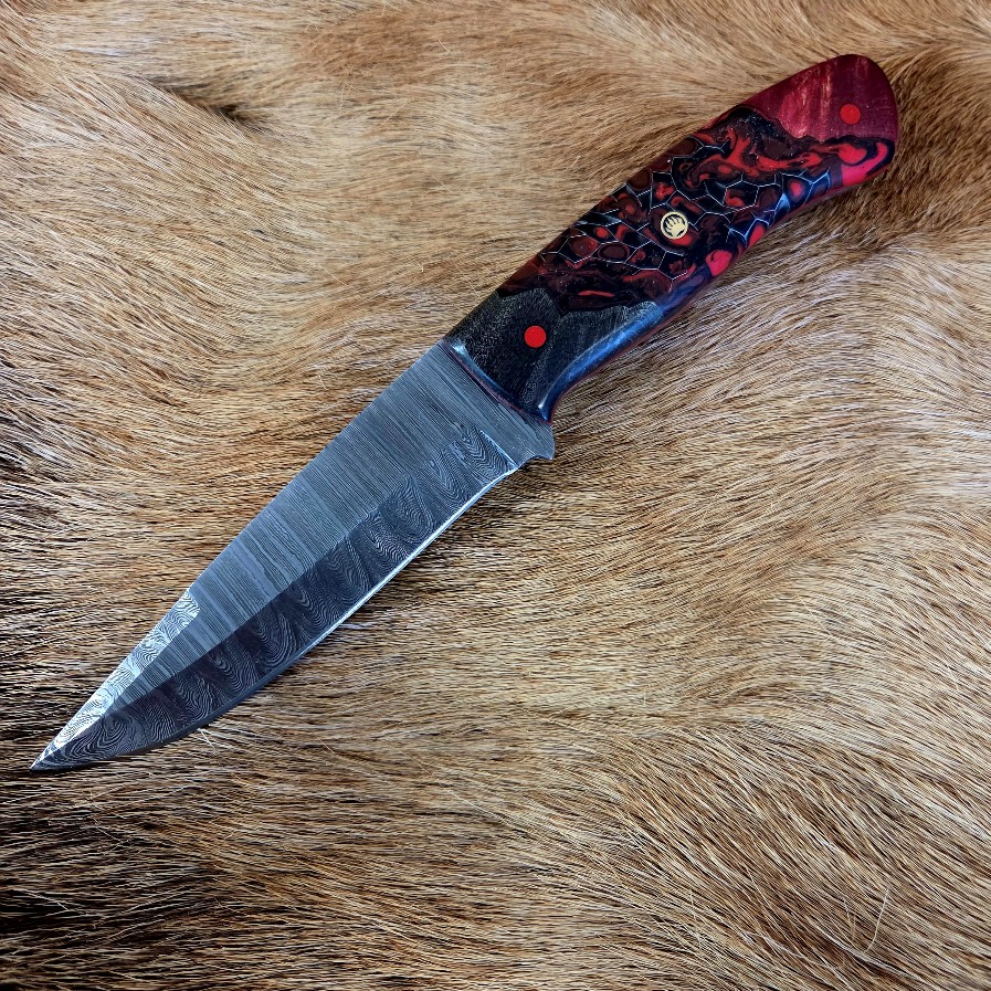 9 3/4″ Overall Length. 5″ Cutting Edge. Aus-10 Core 66 Layers of Damascus Steel Blade. Dyed Maple/Alumilite® Honeycomb Resin Handle. Custom Leather Side Sheath. Great Outdoor Knife.