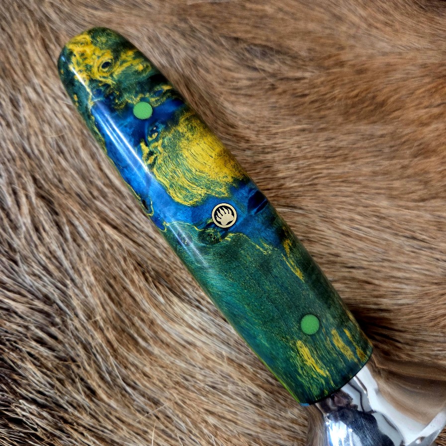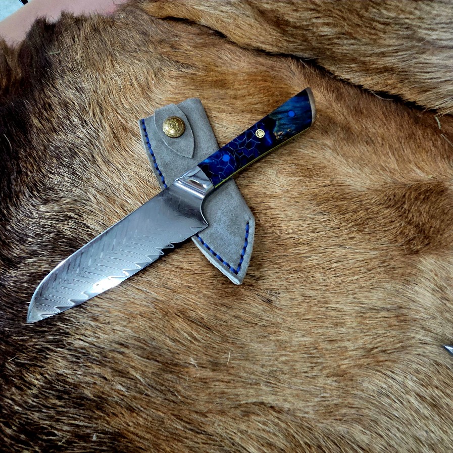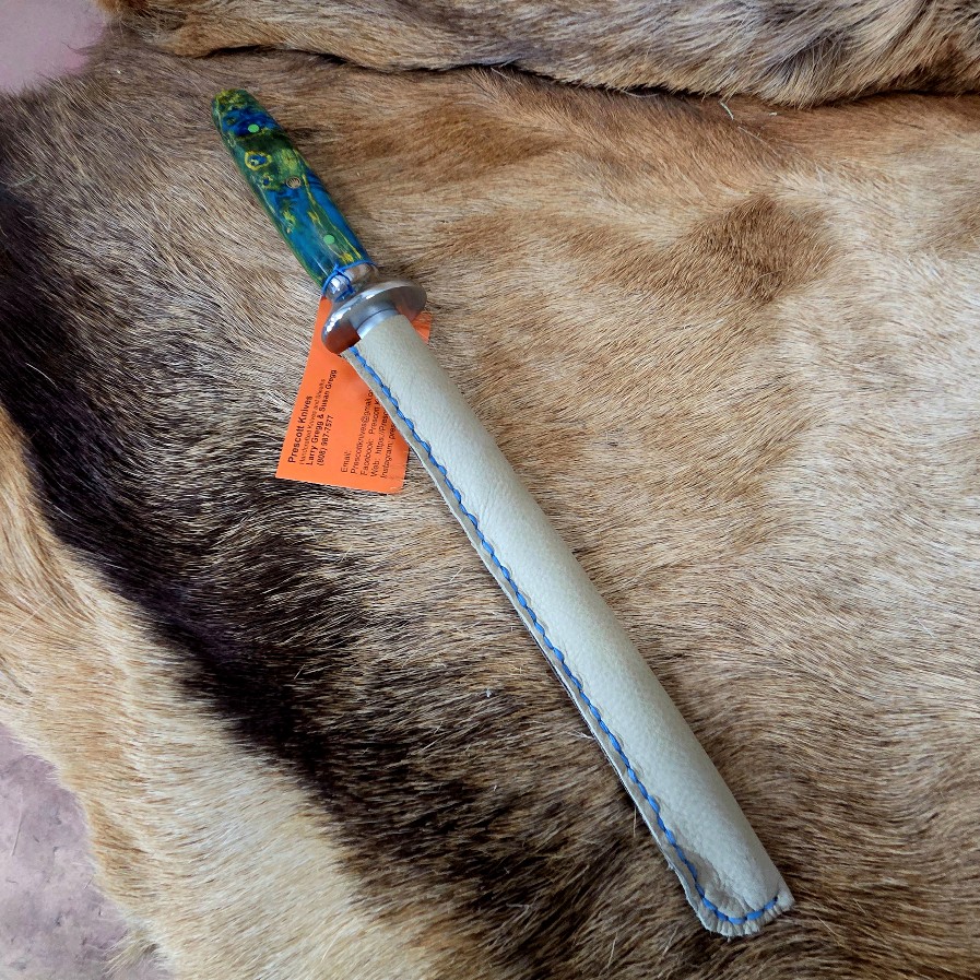 13 1/2″ OAL with a 10″ Rod Blade.  High Carbon Steel. 3000 grit.  Dyed Box Elder Handle.